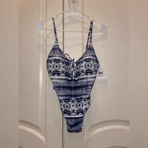 Indigo Rein blue and white Aztec tie dye one piece swimsuit with high leg
