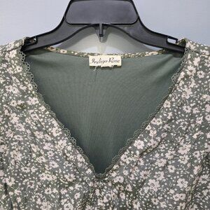 Keywords: Indigo Rose, dress, midi, green, floral, print, V-neck, ruffle sleeve, cap sleeve, elastic waist, A-line, casual, summer, spring, bohemian, boho, lace trim.