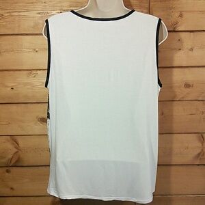 Lace front has wide stripes of navy and white and is lined with silky 100% polyester. Back is a solid white lightweight and stretchy 95% rayon/5% spandex. Front lace is a cotton blend and has minimal stretch. Very good condition, no pilling or snags. Chest measures approx 21" from underarm seam to underarm seam. Length is approx 24". Size large.