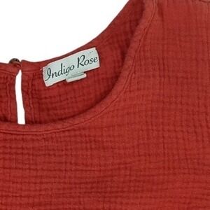 Women's rust colored gauze dress from Indigo Rose. Features a comfortable smocked empire waist, flutter sleeves with ruffle trim, and a tiered ruffled skirt. A back button closure with a keyhole cutout adds a sweet detail. Perfect for a picnic or a casual day out.