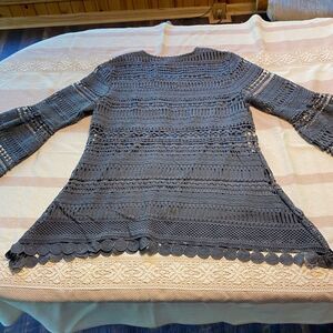 Indigo Soul Gray Crochet/Open Lacy, Lined Tunic Top. Bell sleeve, gray lining. Excellent used condition. Size large. Measures chest 42”, length 31”, sleeve 22”.