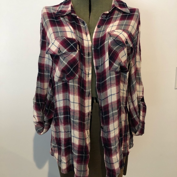 Long sleeve plaid Maroon button up with an accented back inlay.