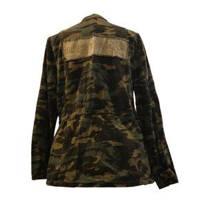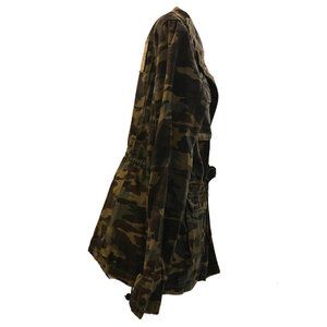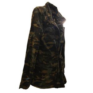 Indigo Threads Co. Women's Medium Green Camouflage Cotton Light Zip-Up and Button Up Jacket with 4 Pockets, a Tie Around the Waist, Collar, and Snap Buttons.