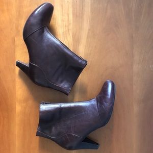 Very comfortable 2.5” heel brown ankle boot. Some wear on toe that could easily be remedied w/polish and some wear on the heels. Padded and flexible sole.