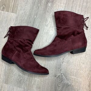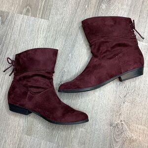 Faux suede with tie decor on back Please see images for color and measurements EUC!