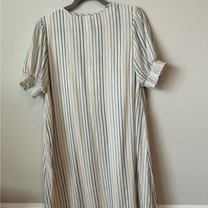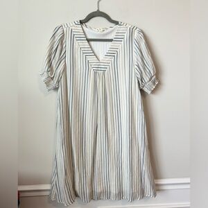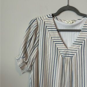 Elevate your style with this elegant mini dress featuring classic blue and white stripes. Designed with a flattering V-neck and charming puff sleeves, it's perfect for any occasion.