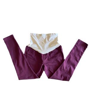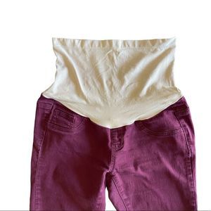 Maroon maternity skinny ankle pant featuring Secret Fit Belly band, back pockets, faux front pocket