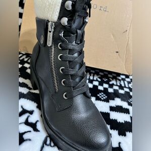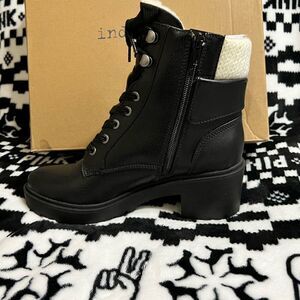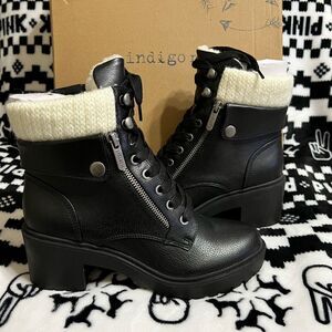 Edgy accents like exposed zippers and lug soles combine with the snuggly softness of ribbed-knit sweater collars in the Megan combat-style boots from indigo rd
