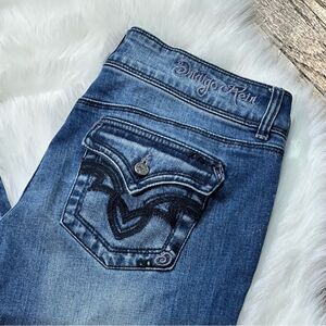 Stylish blue jeans by Indigo Rein. Features a unique back pocket design. Perfect for casual wear.