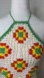 White mini crochet dress with a halter neck which leads to lace up back and midsection cut-out sides. The dress features a pattern of colorful granny squares in shades of green, yellow, and orange,as well as a bodycon silhouette. Dress is lined