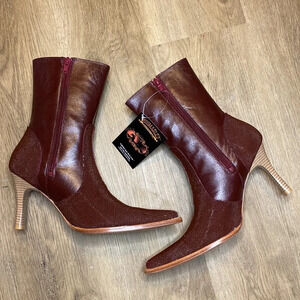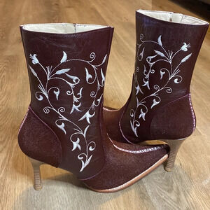 Brilliant Design, one of a kind shape leather boots made in Mexico. Stylish Western Heeled Boots in Ox Blood with cream stitched floral design down the side. Mexican size 25 US 7.