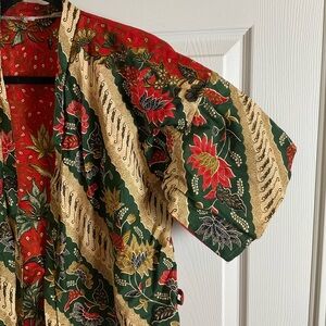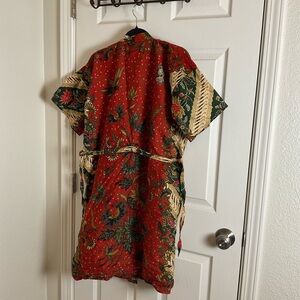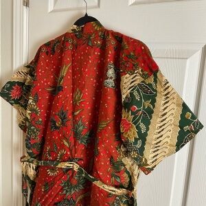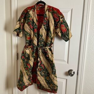 Elegant kimono robe featuring a vibrant floral pattern. Includes a front pocket and a matching belt for a perfect fit.