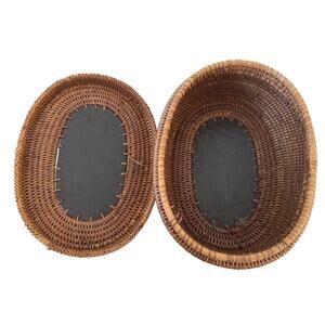 Indonesian Lombok woven reed grass basket trinket box with carved frog lid.