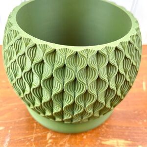 The planter is 3D printed using eco-friendly, biodegradable PLA plastic filament. 3D printing is done by printing layer upon layer of filament to build up and create the print.