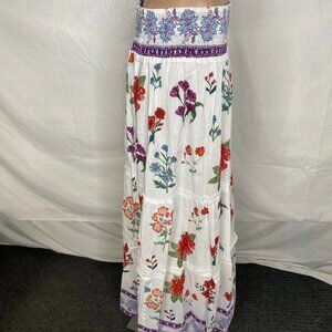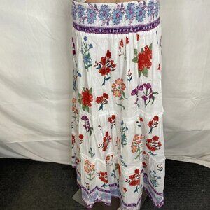 New with tags. The Indu Nour Wild Flower Midi Skirt in white with multicolor floral print brings effortless charm to warm-weather dressing. Crafted from breathable cotton, this skirt features a flowing silhouette that moves beautifully with every step.