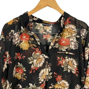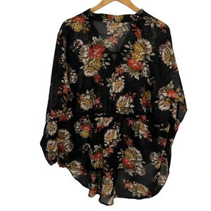 Indulge In Style 2X Sheer Black Floral Blouse Drawstring Waist Pullover V Neck
