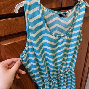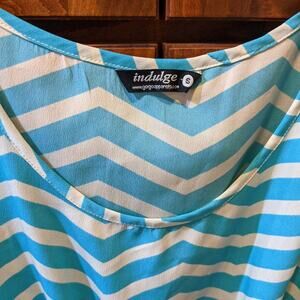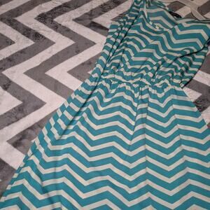 Indulge. Size small. High/low style dress covered in a teal blue and white Chevron pattern. Stretchy at the waist.