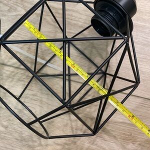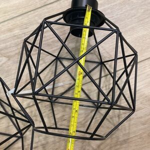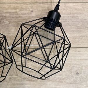 Set of two new unused cage faceted industrial pendant lights. Great for modern and contemporary decor for that loft space feel. Look spectacular with Edison bulbs. Easy to install, one lightbulb each perfect for kitchens and stairways.