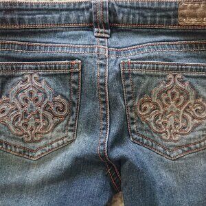Industrial Cotton, dark-wash jeans. The label says its a size 5, but it's smaller than a normal 5. The waist measures just under 28 inches (the material has some stretch to it). Inseam is 30 inches, and the rise is 6.5 inches. I think it's halfway between boot cut and flare style.