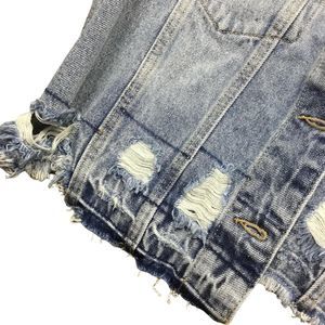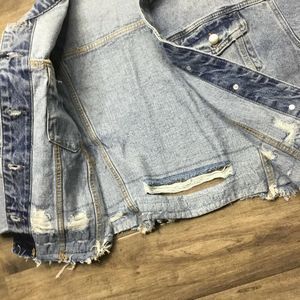 Industries Jeans Jacket Women Sz.Large Blue Denim Long Sleeve Distressed Raw Hem