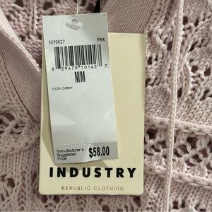 Industry Clothing pink crochet knit short sleeve sweater is new with tags and perfect for adding a touch of texture to your wardrobe. Designed with a delicate open-knit style, it offers a flattering fit with a chest measurement of approximately 32” and a length of about 18”. A versatile piece that can be styled casually or dressed up with ease.