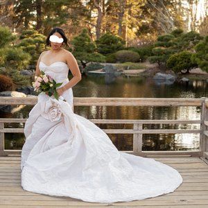 The dress is convertible from a full length ballgown to a high-low dress. The front panel is easily removable with snap buttons. The tailor added a zipper to easily remove the crinoline from behind making the dress much more comfortable to move around, sit and dance in. The dress was custom made to my body but is closest to a size 18. I am a size 8 in jeans and Medium in shirts regularly. This dress was used once and has been dry cleaned. This dress is ready to make another happy bride!