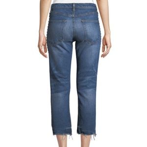Veronica Beard 'Ines' jeans with rhinestone-studded tuxedo stripes. Mid-rise; five pocket style; straight legs; button/zip fly; belt loops. crop length; frayed hem; cotton/polyurethane. Preowned and in very good condition.
