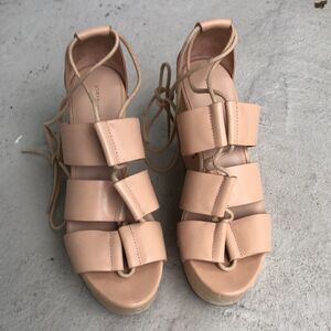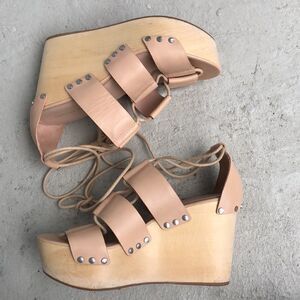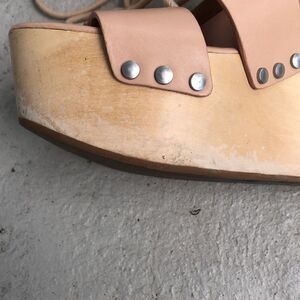 Super cute but not perfect so please look at all the pictures. The wood needs a little cleanup unpolished and would come back well. Has a little chip missing in the front of one toe which is barely visible. Platform height is 2 inches and heel height is 4 inches. Leather is in perfect condition