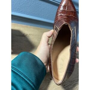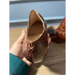Keywords: Inez booties, ankle boots, crocodile embossed, leather shoes, stiletto heels, brown boots, pointed toe, women's footwear, designer boots, fashion shoes, size 8.5M, dress boots, heeled booties