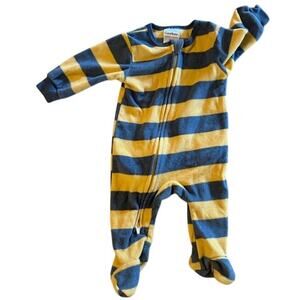 Gerber “just born” fleece zip sleeper — yellow/charcoal wide stripes; 100% polyester.