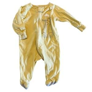 Gerber zip sleeper — soft yellow with giraffe graphic “happy together”; 100% cotton.