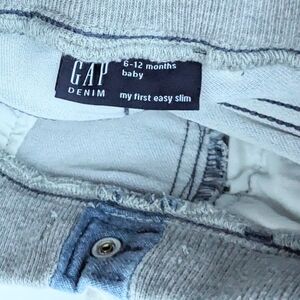 - GAP Baby denim, pull-on, 5 pockets, faux snap/zip closure light wash jeans with a ribbed waist band & faux drawstring pull. 79% Cotton/19% Polyester/2% Spandex.