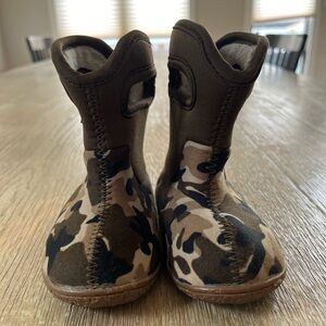 Bogs Brown and Black Camouflage Boots. These boots are designed with a waterproof exterior and insulated lining to keep feet warm and dry. The durable sole ensures excellent traction, making them ideal for outdoor adventures. In great condition, worn one winter! No holes or stains