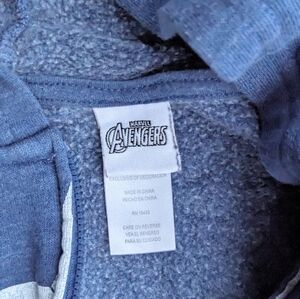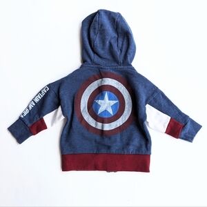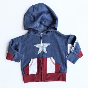 - Blue (Red/White accents), front zip closure hoodie with front pockets and Captain America shield on back, Captain America writing on left sleeve, white star on chest, red/white highlights on pockets & under sleeves and red accented ribbed waist. 60% Cotton/40% Polyester. Gently Loved. Great Condition!