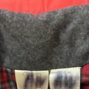 Plaid (red/black/grey) accent at nape of neck.