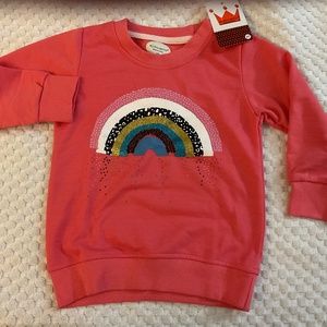A fun and super stylish rainbow themed pullover sweatshirt. A beautiful peach colored sweatshirt with a fun, colorful rainbow! Size 2T and made by Aosta Betty. NEW WITH TAGS still attached.