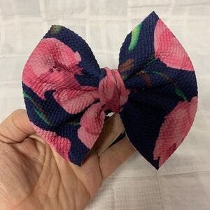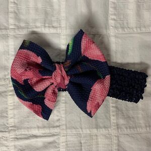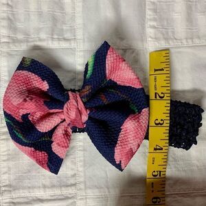 This pretty handmade bow is a new bow, that is made with single knit fabric. The crochet band is elastic. It is size Newborn and fits a head circumference of 12” to 13”.