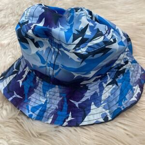 Infant Kid's Blue Reversible Shark Bucket Hat Sun Hat. Baby bucket hat perfect for sun perfection. Reversible. Features a blue shark. Water proof.