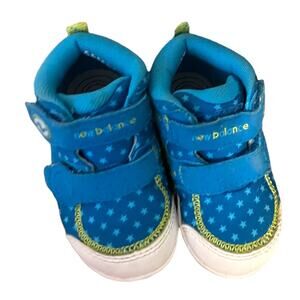 These sneakers are in great preowned condition. Very gently worn. High top style. Hook and loop closure. Fun colors with stars. Rubber soles