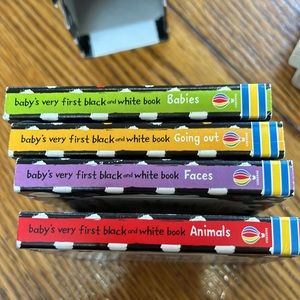I can’t game and books . Usborne Happy Baby black and white library. Hardback books in mostly black and white. All 4 and case included. Also included are s Bright Rise Harvedt Memiry game for up to 6 months. One game piece and cards missing but still fun for baby.