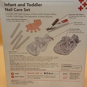 Infant and toddler nail care set. Includes gray and red mittens. Perfect for gentle grooming.