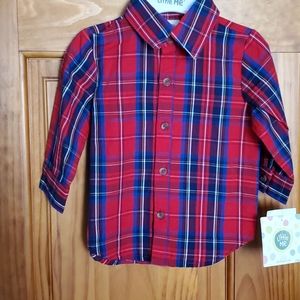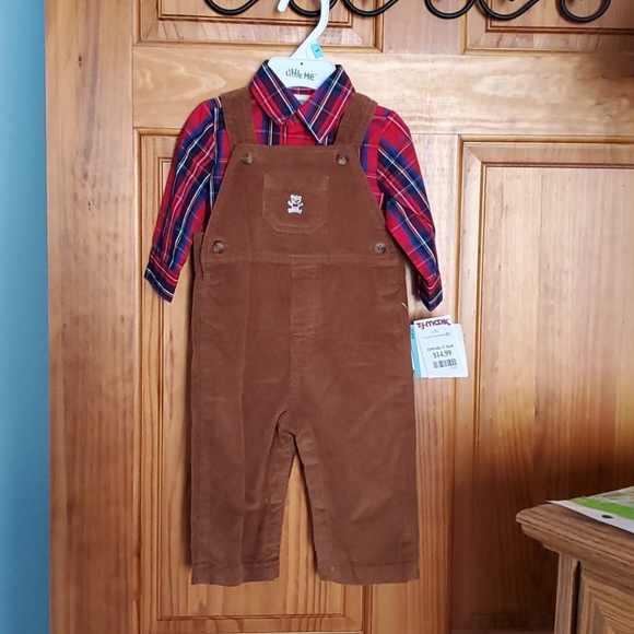 Corduroy adjustable overalls. Snaps at legs for easy diaper change. Red/blue plaid button down shirt. Never worn.