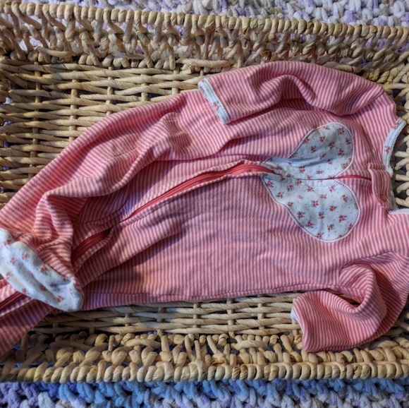 Pink and white stirpes with heart ( filled with flowers) over chest.