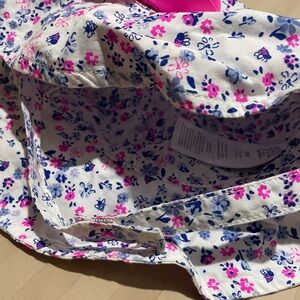 Just One You, by Carter's, white sun hat with blue tiny floral print is size 9mos (17-21lbs.) and in EUC. Velcro chin strap is somewhat offset so not right on babies chin/neck. Hat is lightweight, drys quickly, keeps sun out of babies eyes. Print is same on inside, so it could be reversible, although chin strap does not coordinate with hat inside out.