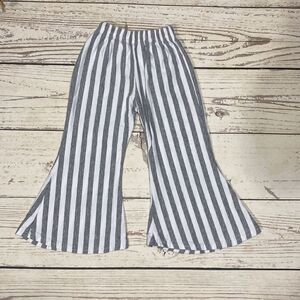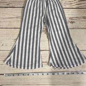 Gray and white striped bell bottom pants with coordinating off-shoulder top. Top has velvet feel to it.