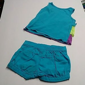 Infant's 2-pc Short Set. Top is sleeveless with 3 rows of lace in aqua blue, lime green, & purple. Solid blue back. Shorts have faux front pockets & elasticized waistband in the back only. In excellent condition. Sz 6-9mos. From Garanimals.