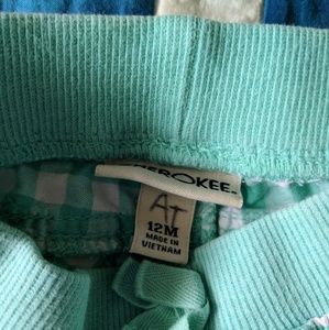 Two piece set including a Hatley onesie dress (size 12-18 months) in an adorable purple and teal bunny print, and Cherokee gingham shorts (size 12 months) in teal and white. Shorts have initials on the tag, no other visible signs of wear. Onesie worn once, excellent condition!