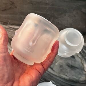 These three frosted votives or small tiki cups are in excellent condition. There are no brakes, chips, flea bites, hairlines, damage, or repairs. They sit on small pedestals. Infinite faces go around the glasses. Beautiful frosted glass. Possibly made in France, but these glasses are unmarked and unsigned. From a fine Sarasota, Florida estate.