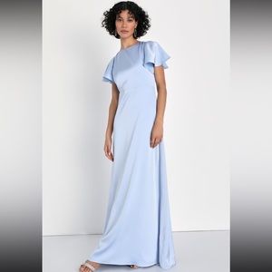 With a look like the Lulus Infinite Invites Powder Blue Satin Backless Boat Neck Maxi Dress, your calendar will be full of fabulous affairs this season! This effortlessly romantic dress is composed of sleek woven satin that shapes a darted bodice, a flattering boat neckline, and fluttery short sleeves. The fitted waist tops an A-line skirt that cascades down to a sweeping maxi hem. A button-loop closure secures above an open-back cutout that lends a flirty finishing touch to this elegant ensemble!