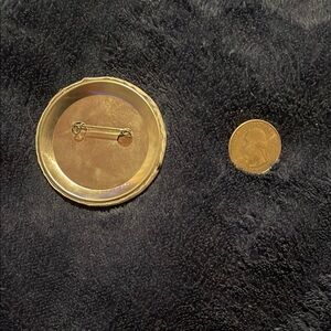 Round button pin with 'Infinite Rizz' text. Quarter for size comparison.